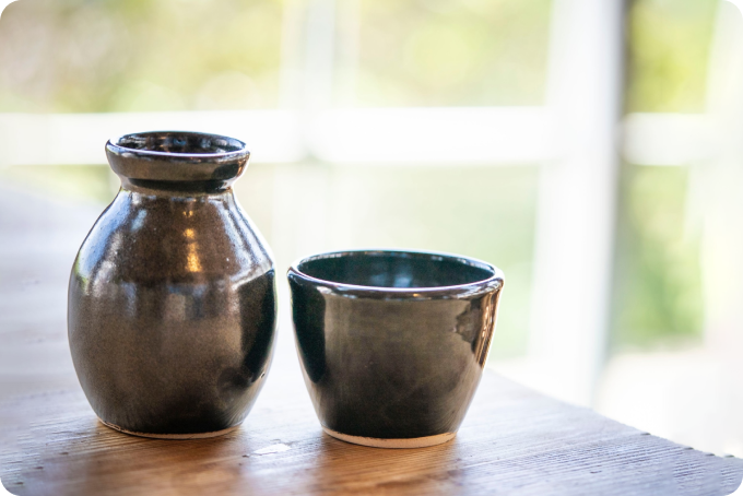 渋みのある「黒天目」という釉薬で焼き上げた蕎麦猪口と蕎麦徳利